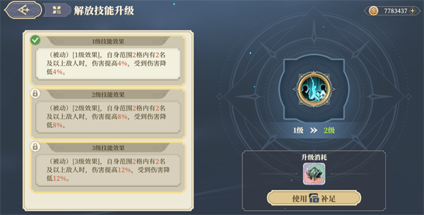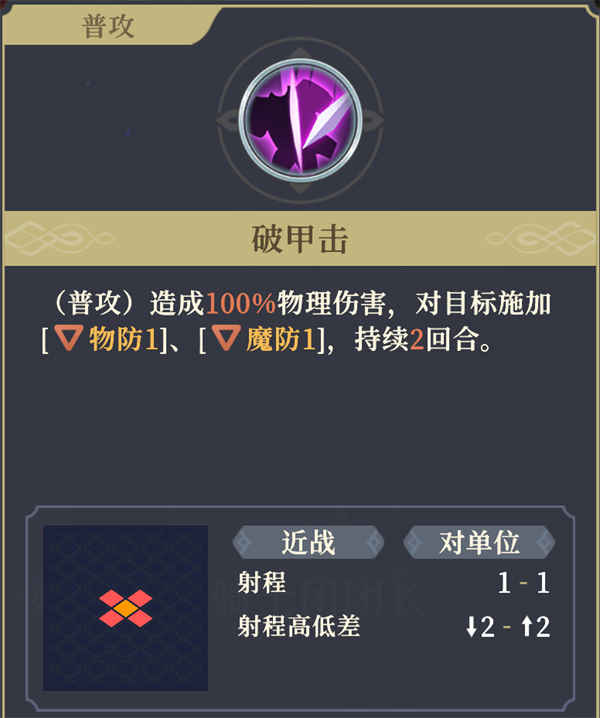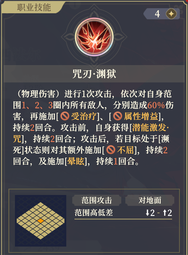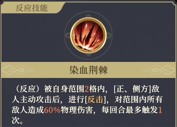 各星級效果:初始移動力小于等于3時,自身移動力增加1格;攻防屬性提高3% / 3% / 6% / 6%/ 9%。戰(zhàn)斗回合開始時獲得3層[鮮血咒鎧],每層攻防屬性降低4% / 3% / 3% / 2% / 2%,最多3層,持續(xù)2回合。