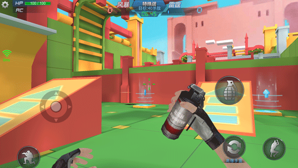 游戲畫面左下角有一個圓圈狀的虛擬按鈕,右下角有個未顯示的虛擬按鈕,玩家通過滑動虛擬按鈕控制人物的動作。其中左下角的虛擬按鈕控制移動右下角的虛擬按 鈕控制準星和射擊。同時,在畫面左上角設置按鈕中有戰績查詢、游戲設置、鍵位設置功能,左下角有蹲下按鈕,畫面右側分布有跳躍、切換武器、換子彈、扔手雷 等按鈕。