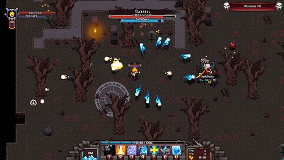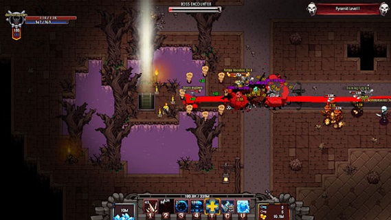 在城鎮(zhèn)中有一個藍(lán)色的橢圓,通過這個橢圓的魔法門我們可以選擇想要進(jìn)入的戰(zhàn)斗區(qū)域。接著就可以開始激動人心的戰(zhàn)斗了。來到一個場景之后,每一個回合都有一定數(shù)量的怪物出現(xiàn)。我們需要控制角色不斷的在場景中擊敗怪物和破壞場景中的箱子來獲得獎勵,有時候我們會撿到裝備,有時候我們會撿到金幣。通過這樣不斷的戰(zhàn)斗獲得獎勵讓自己的等級技能提升,獲得更好的裝備等等。