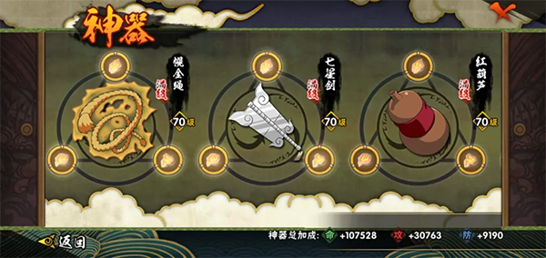各位學員每當使用忍玉將一個神器強化至70級時,另一個神器便會解鎖。如下圖所示: