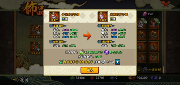 而且在游戲中,飾品與忍具的強化成功對于戰力提升尤為重要。以飾品為例,在強化時,除了消耗秘術之塵、秘術之星這些固定的道具外,還會消耗保護符,以提升強化成功率。如下圖所示: