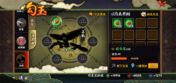 為裝備與通靈獸鑲嵌勾玉,并提升勾玉等級,均可提升戰力。