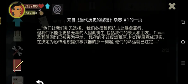 天空之山是一款很受歡迎的角色扮演生存類的手機游戲。是從端游上移植而來的,即便是在手機上也可以體驗到游戲帶給你的魅力的。在游戲內(nèi)玩家將會扮演一位末日世界的幸存者的,需要你在這個充滿著變異喪尸的世界中生存的。游戲的背景是設(shè)定在了第三次大戰(zhàn),男主角僥幸活下來了,需要玩家不斷收集物資,然會活下來的。游戲還是有著超高的隨機性的,是可以為游戲增加更多的樂趣的。想?yún)⑴c就趕緊點擊它下載吧。