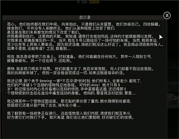 結(jié)局一:世界觀,首次進入游戲會播放一段動畫,大意是歐美和東方(個人感覺就是亞洲)進行戰(zhàn)爭,但是東方投下了生化武器,大家都變異了,而外出的主角為了活著出去見到女兒必須從一百樓殺出去。