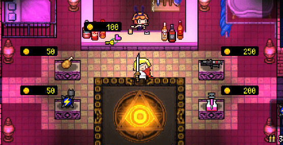 每一層的地圖中都有一名boss,打敗該boss后便能夠進入下一層繼續冒險。在戰斗過程中擊殺怪物或者開啟寶箱都有幾率獲得金幣,這些獲得的金幣可以在商店處購買道具和武器,商店的位置是在地圖中隨機生成的。并且在擊殺敵人時,不僅僅有幾率掉落金幣,還會有一定幾率掉落“藍魂”,“藍魂”作為道具可在地圖中的NPC處解鎖道具槽以及人物動作等一系列的額外附加功能。因為roguelike元素的存在,在流程中玩家在戰斗時被怪物擊殺,便會回到最開始的初始房間“狄加瑪的房間”里并且同時失去身上所有武器裝備,至于獲得的道具以及已解鎖的能力在死后可以保留。