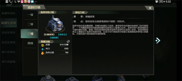 解鎖建筑:施工工地上限3,突擊車工廠上限3,特種車工廠上限3,空軍工廠上限3,機場上限2,船塢上限3,基礎防御塔上限4,炮塔上限3,防空塔上限6,海上防御塔上限4
