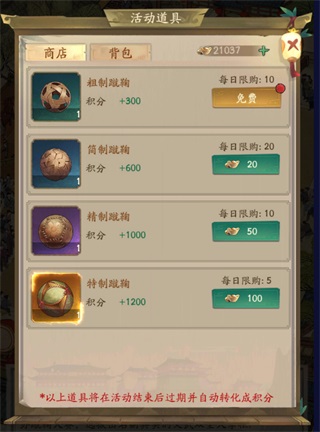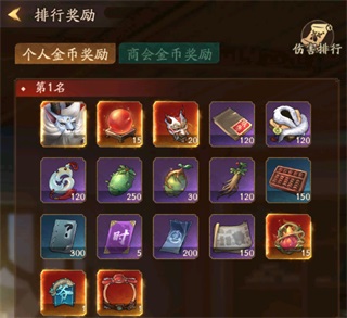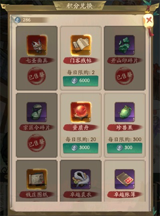 商戰: 商鋪圖紙買滿,玉佩1個,賬簿和裘衣各(3~5)個,分鐘卡,算盤,人參,可買(1~3)個