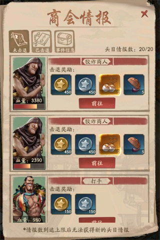 在觸發全服頭目事件后,因為不同戰力不同,掌柜可自行選擇是否追捕遇到的頭目。若放棄追捕且商會情報未達上限時,該頭目情報將自動分享至商會情報中。商會內的其他掌柜可以擊敗對應頭目并獲得對應的擊退獎勵哦~