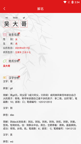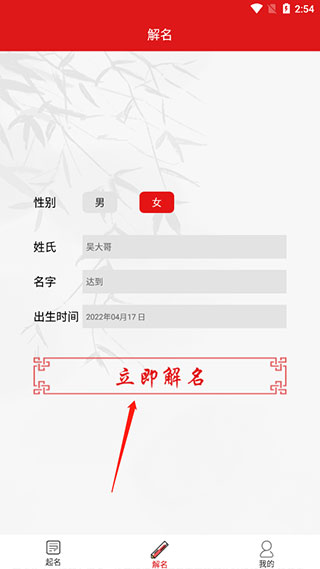 3、點(diǎn)擊解名可以查看這個名字的意思和系統(tǒng)八卦算法等