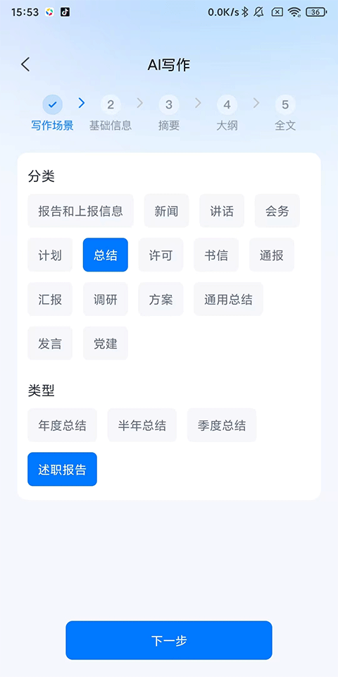 2、選擇寫作分類:報告、總結、 新聞 、講話等,類型:年度/季度/月度總結、述職報告等,點擊下一步;