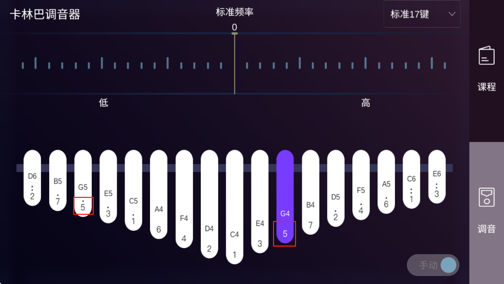 這個音低了需要調(diào)高一點。音低敲低,音高敲高,只需要把卡林巴的頂端當作高處,底端當作低處就可以了。音低敲低,音高敲高,這個so,就需要拿起小錘子找到這個音,從下往上敲,敲低處就可以了,敲兩下,然后再彈一下,這個時候可以看到這個光標就變成了綠色,就說明這個音調(diào)準了。