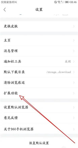 3、這時就會打開360瀏覽器的設置界面,點擊界面中的擴展功能菜單項
