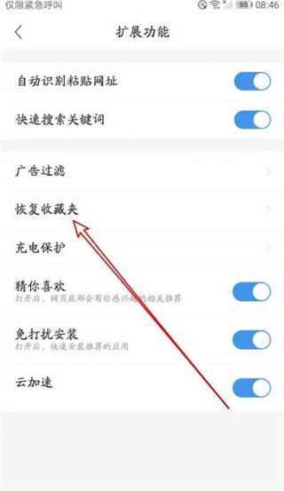 4、然后在打開的擴展功能頁面中點擊恢復收藏夾的設置菜單