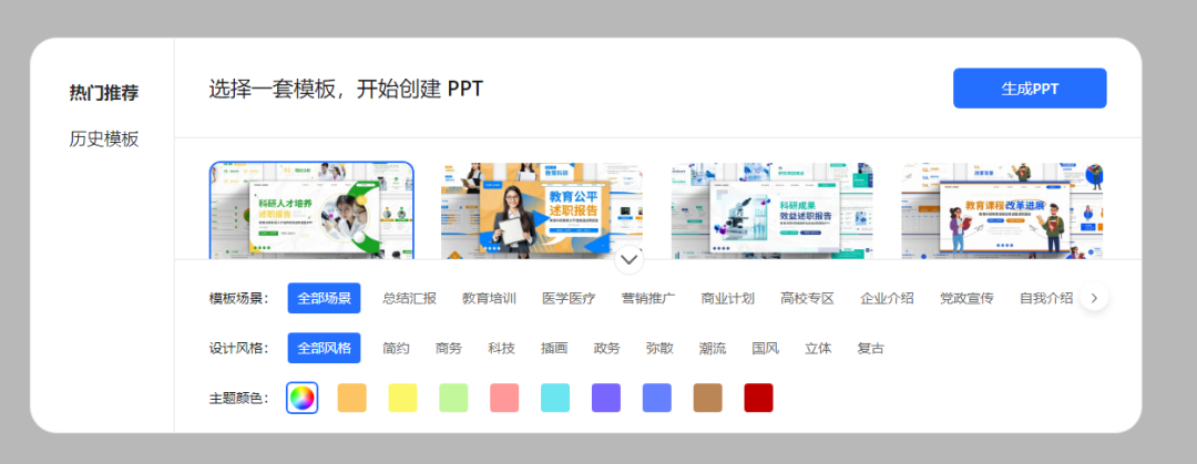 生成完大綱,點擊底部“一鍵生成PPT”,選擇PPT模版。